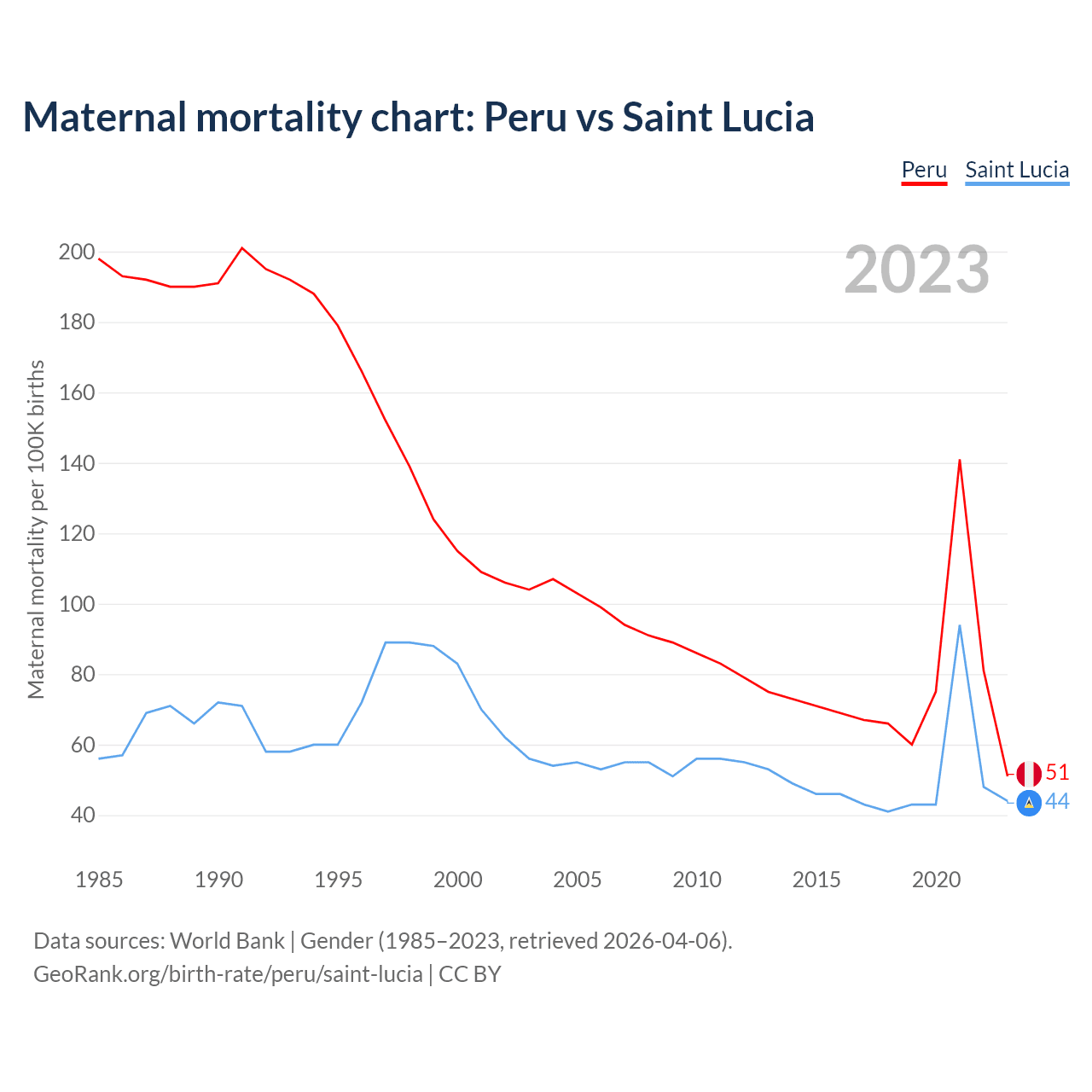 The maternal mortality rate, which is the probability of dying during childbirth or within 42 days of pregnancy termination, is 51 deaths per 100,000 live births in Peru, compared to 44 deaths in Saint Lucia.