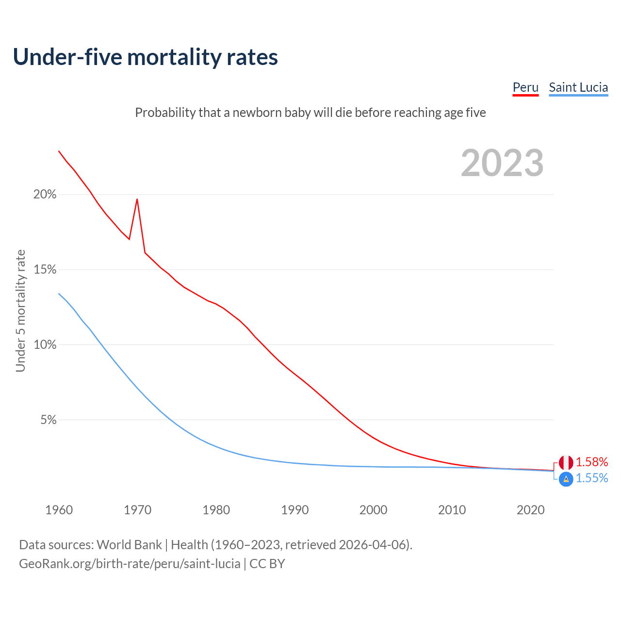 The chance that a newborn baby will die before reaching age five is 1.58% in Peru and 1.55% in Saint Lucia. Above is a chart with historical data on under-five mortality rates.
