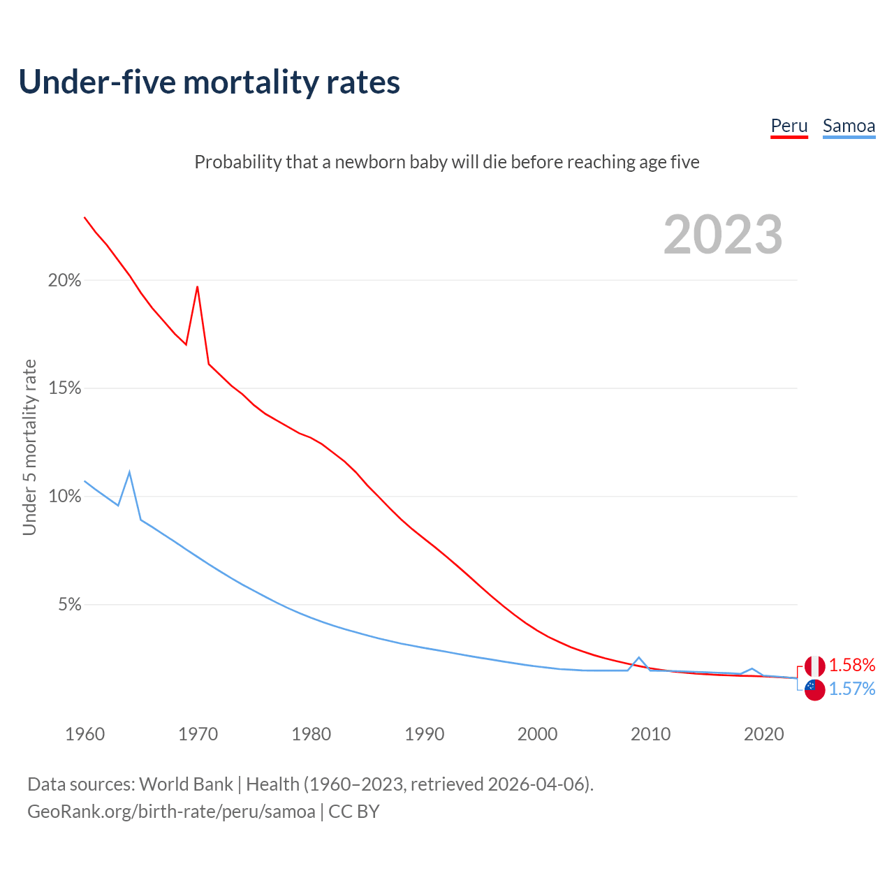 The chance that a newborn baby will die before reaching age five is 1.58% in Peru and 1.57% in Samoa. Above is a chart with historical data on under-five mortality rates.