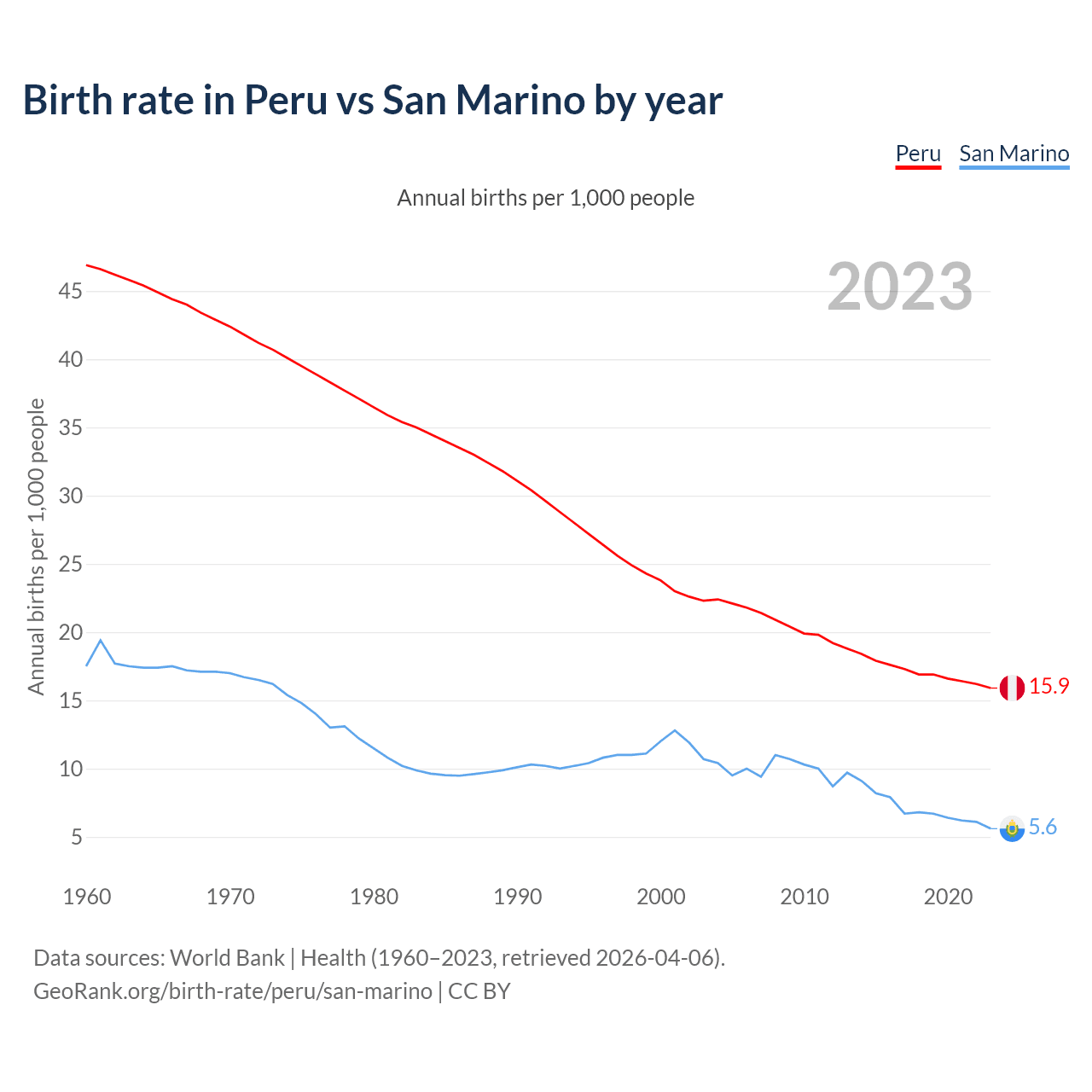 Peru has an annual birth rate of 15.9 births per 1,000 people, compared to 5.6 for San Marino. The average number of children a woman is expected to have during her lifetime — the fertility rate, is 1.98 in Peru and 1.15 in San Marino — 42% difference.