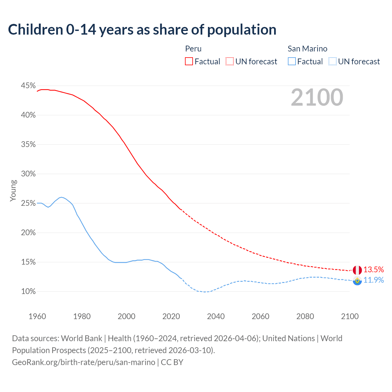 According to the latest available data on birth rates, the fertility rate in Peru was 1.98 children per woman in 2023, compared to 1.15 in San Marino in 2023. The replacement level is considered to be 2.1 children per woman.