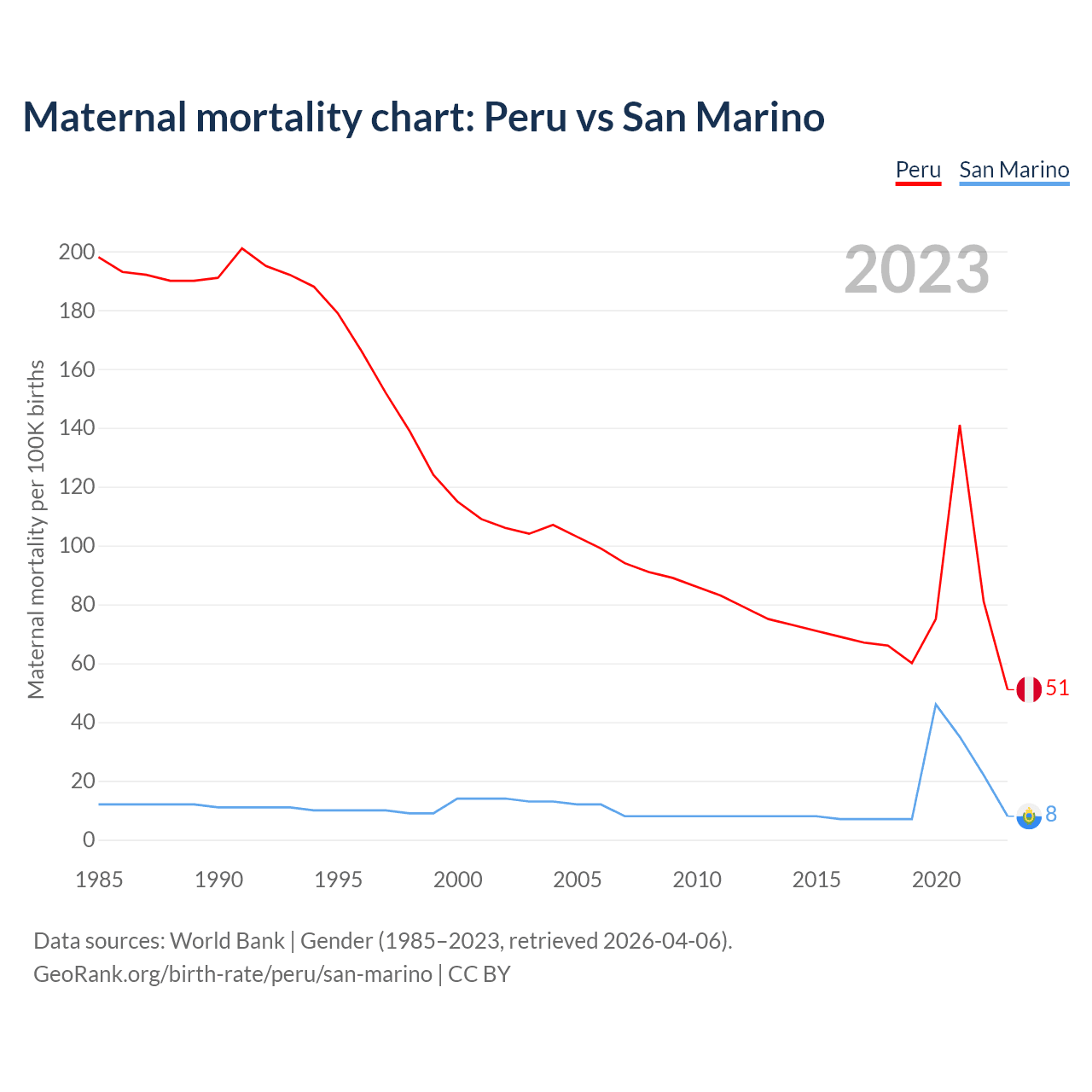 The maternal mortality rate, which is the probability of dying during childbirth or within 42 days of pregnancy termination, is 51 deaths per 100,000 live births in Peru, compared to 8 deaths in San Marino.