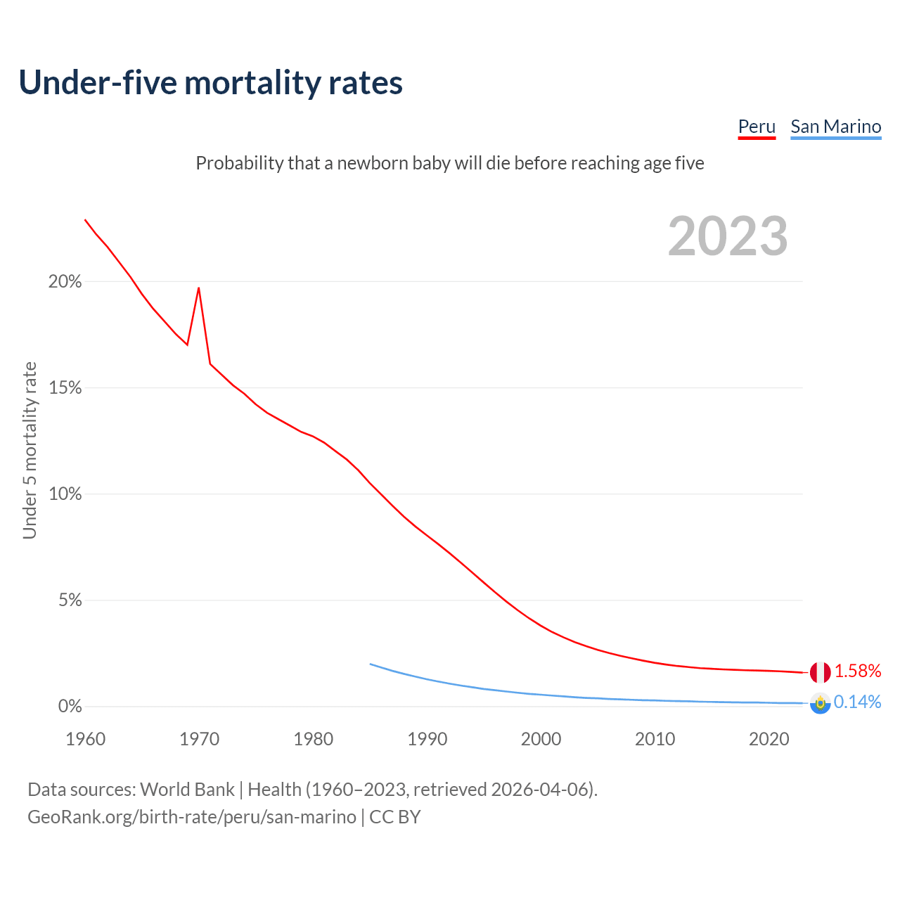 The chance that a newborn baby will die before reaching age five is 1.58% in Peru and 0.14% in San Marino. Above is a chart with historical data on under-five mortality rates.