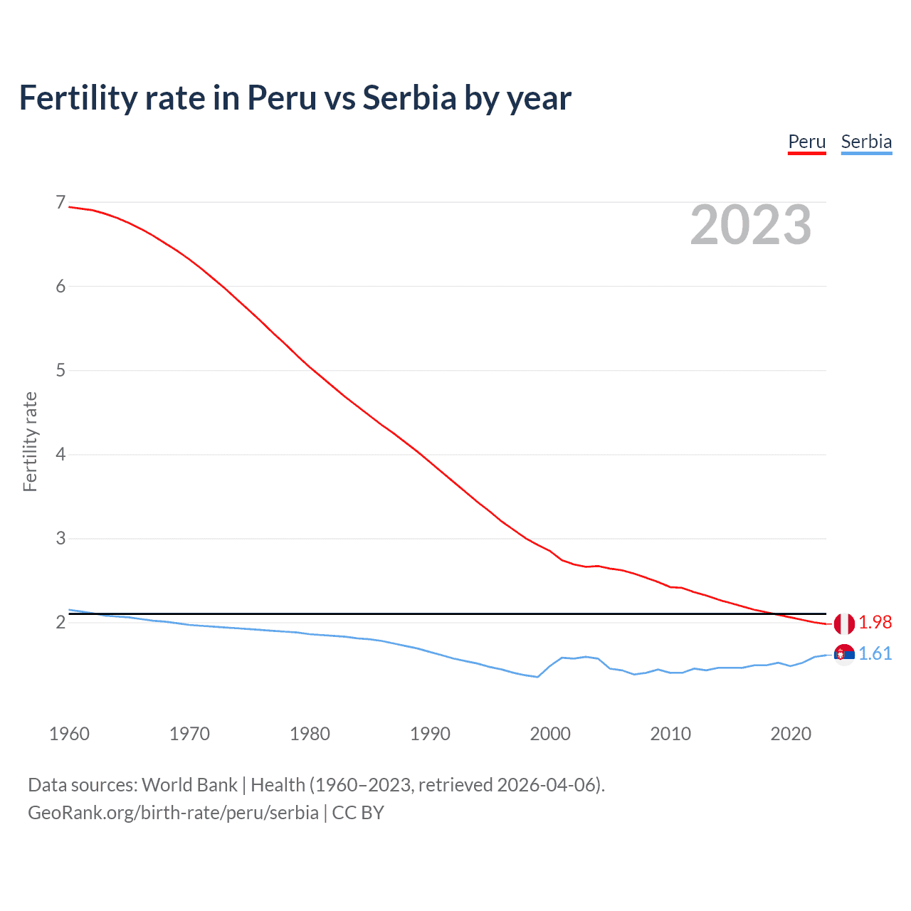 1960 vs 2023, the fertility rate has decreased by 71.5% in Peru and by 25.3% in Serbia — in 1960, it was 6.94 and 2.15, respectively.
