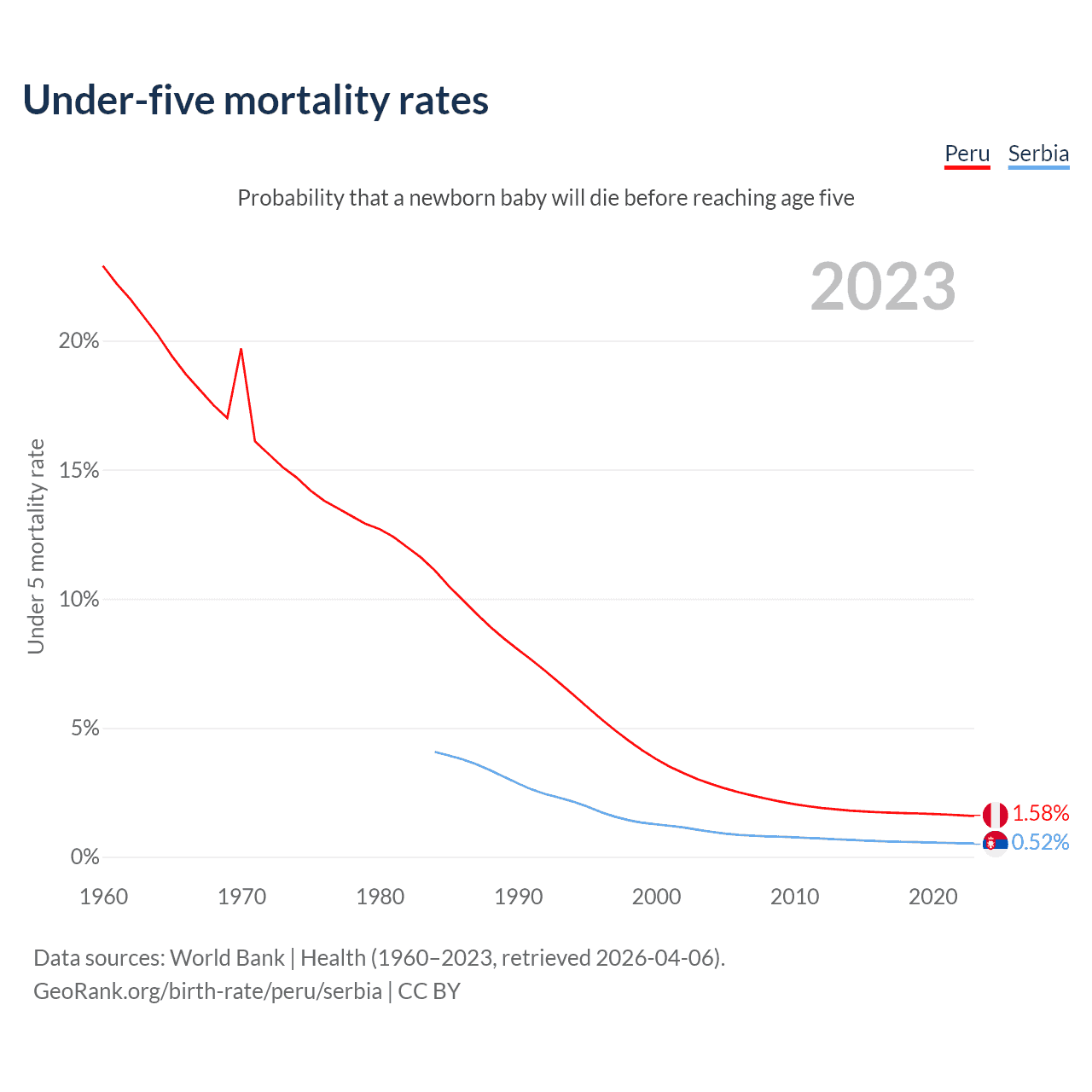 The chance that a newborn baby will die before reaching age five is 1.58% in Peru and 0.52% in Serbia. Above is a chart with historical data on under-five mortality rates.