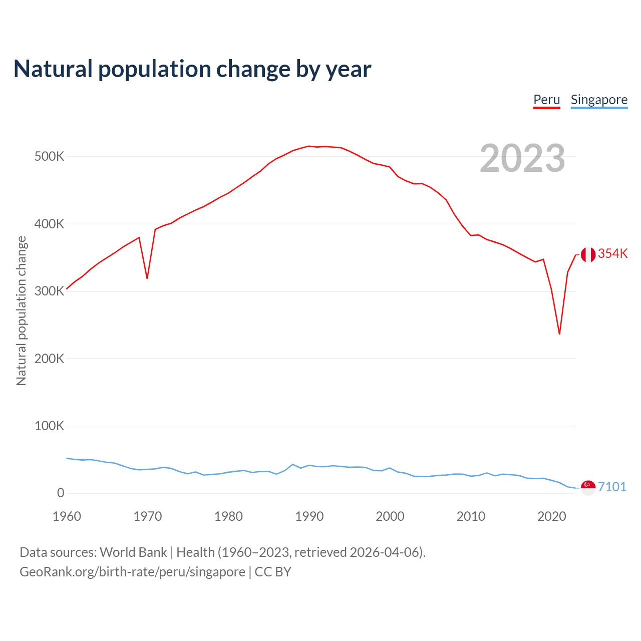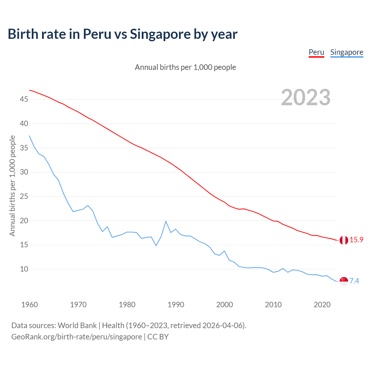 According to the latest available data on birth rates, the fertility rate in Peru was 1.98 children per woman in 2023, compared to 0.97 in Singapore in 2023. The replacement level is considered to be 2.1 children per woman.