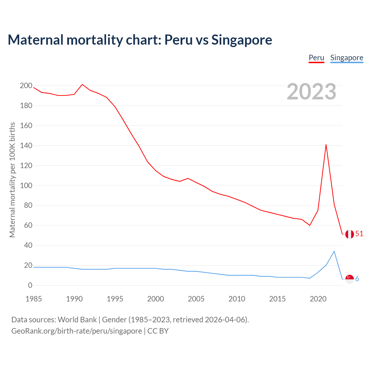 The maternal mortality rate, which is the probability of dying during childbirth or within 42 days of pregnancy termination, is 51 deaths per 100,000 live births in Peru, compared to 6 deaths in Singapore.