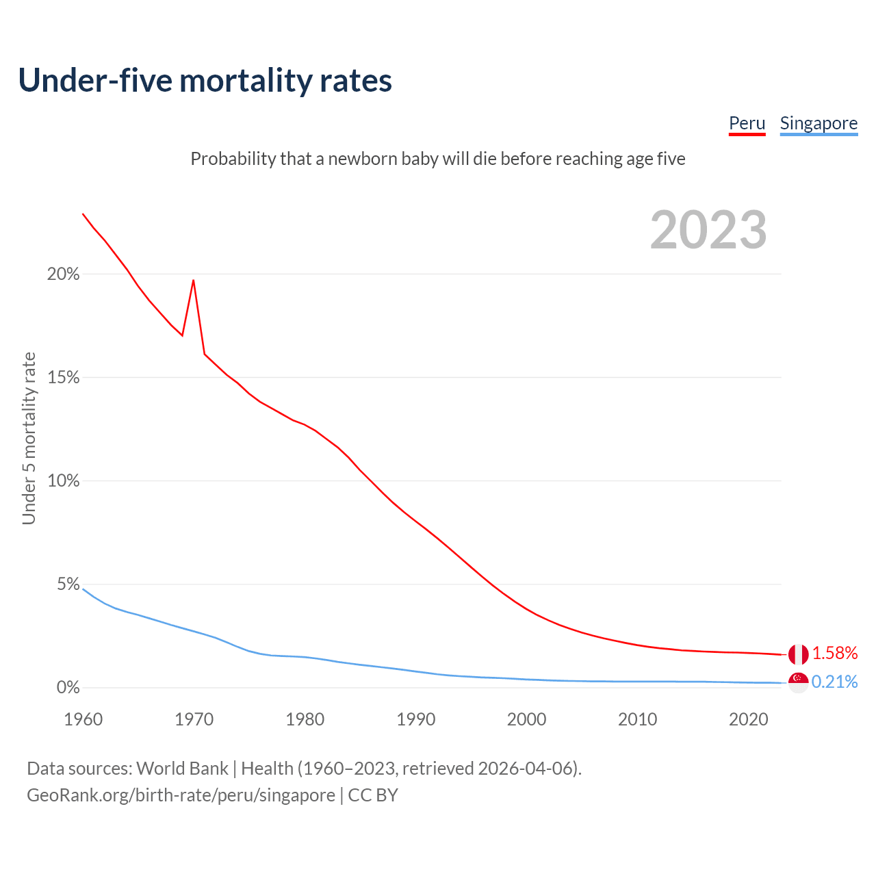The chance that a newborn baby will die before reaching age five is 1.58% in Peru and 0.21% in Singapore. Above is a chart with historical data on under-five mortality rates.
