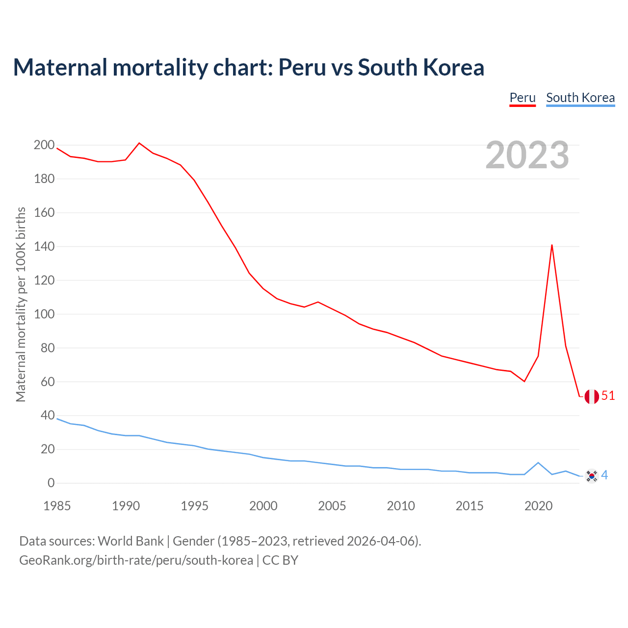 The maternal mortality rate, which is the probability of dying during childbirth or within 42 days of pregnancy termination, is 51 deaths per 100,000 live births in Peru, compared to 4 deaths in South Korea.
