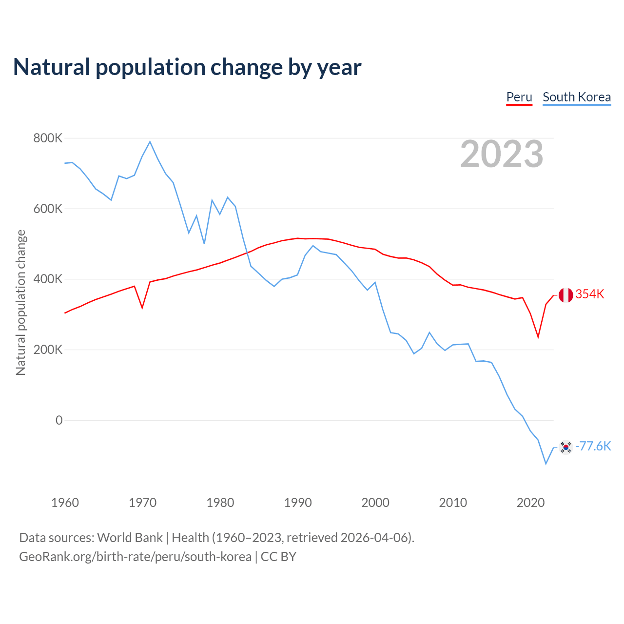 According to the latest available data on birth rates, the fertility rate in Peru was 1.98 children per woman in 2023, compared to 0.72 in South Korea in 2023. The replacement level is considered to be 2.1 children per woman.