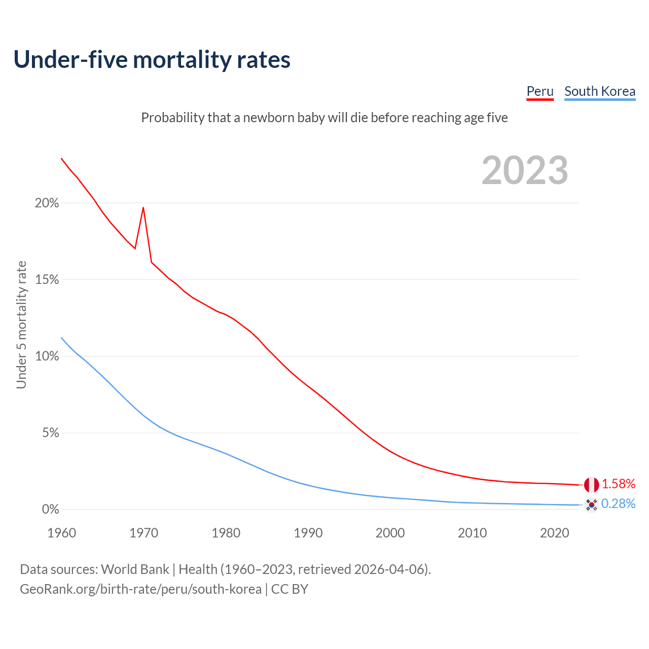 The chance that a newborn baby will die before reaching age five is 1.58% in Peru and 0.28% in South Korea. Above is a chart with historical data on under-five mortality rates.