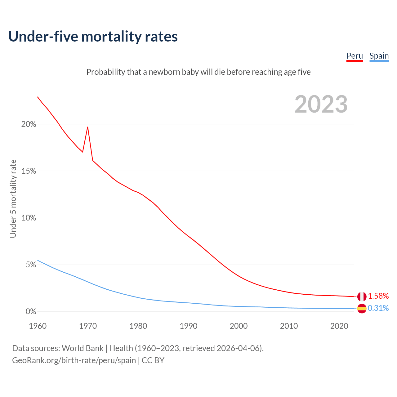 The chance that a newborn baby will die before reaching age five is 1.58% in Peru and 0.31% in Spain. Above is a chart with historical data on under-five mortality rates.