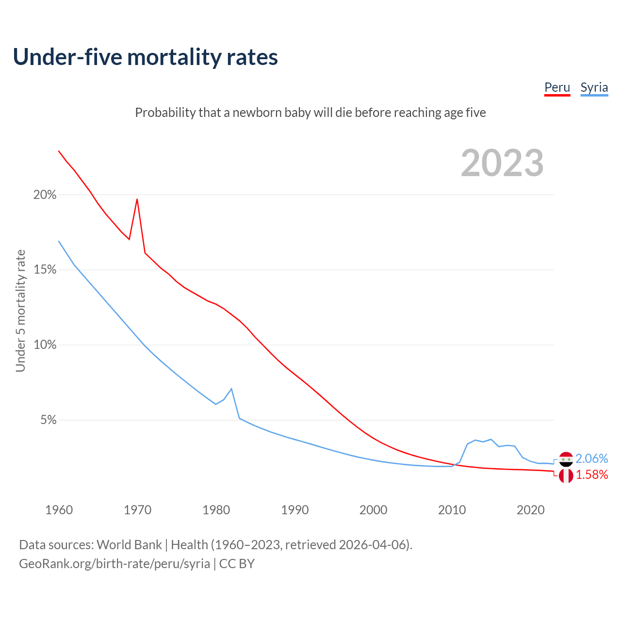 The chance that a newborn baby will die before reaching age five is 1.58% in Peru and 2.06% in Syria. Above is a chart with historical data on under-five mortality rates.