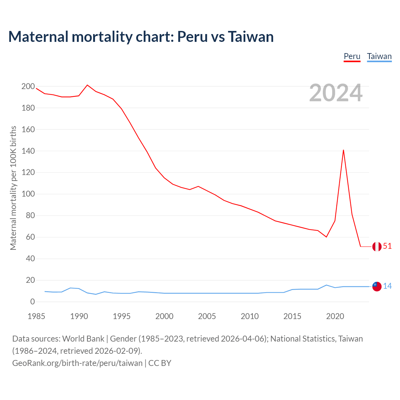 The maternal mortality rate, which is the probability of dying during childbirth or within 42 days of pregnancy termination, is 51 deaths per 100,000 live births in Peru, compared to 14 deaths in Taiwan.