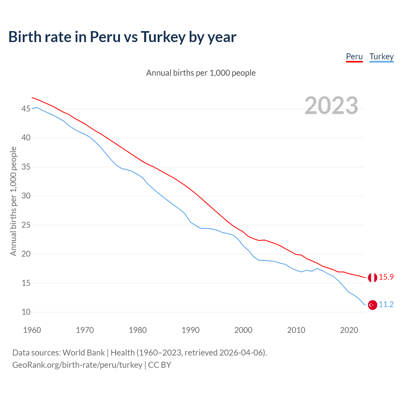 Peru has an annual birth rate of 15.9 births per 1,000 people, compared to 11.2 for Turkey. The average number of children a woman is expected to have during her lifetime — the fertility rate, is 1.98 in Peru and 1.51 in Turkey — 23.7% difference.