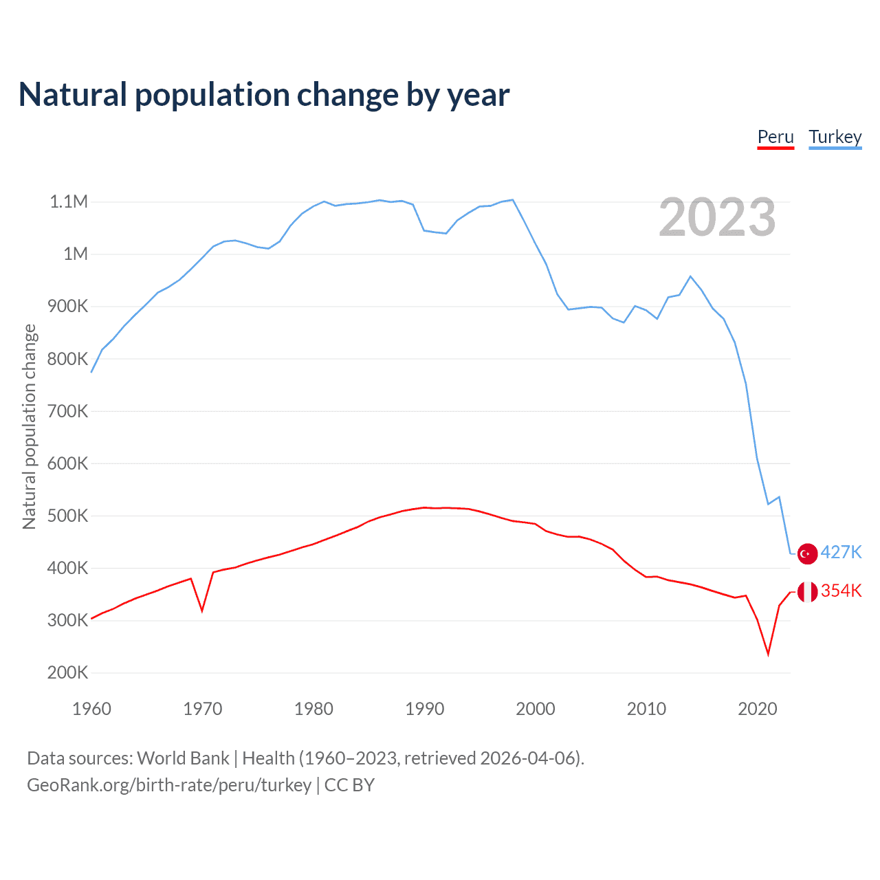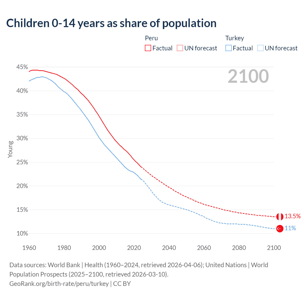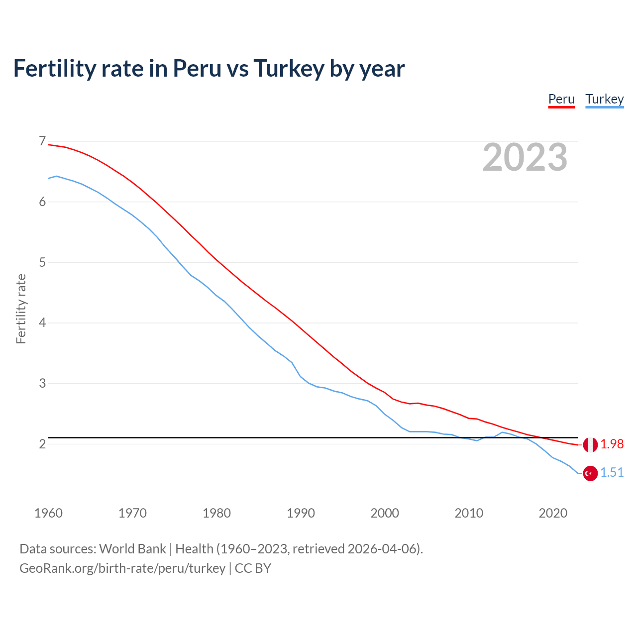 According to the latest available data on birth rates, the fertility rate in Peru was 1.98 children per woman in 2023, compared to 1.51 in Turkey in 2023. The replacement level is considered to be 2.1 children per woman.