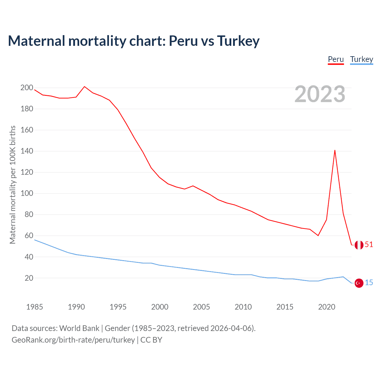 The maternal mortality rate, which is the probability of dying during childbirth or within 42 days of pregnancy termination, is 51 deaths per 100,000 live births in Peru, compared to 15 deaths in Turkey.