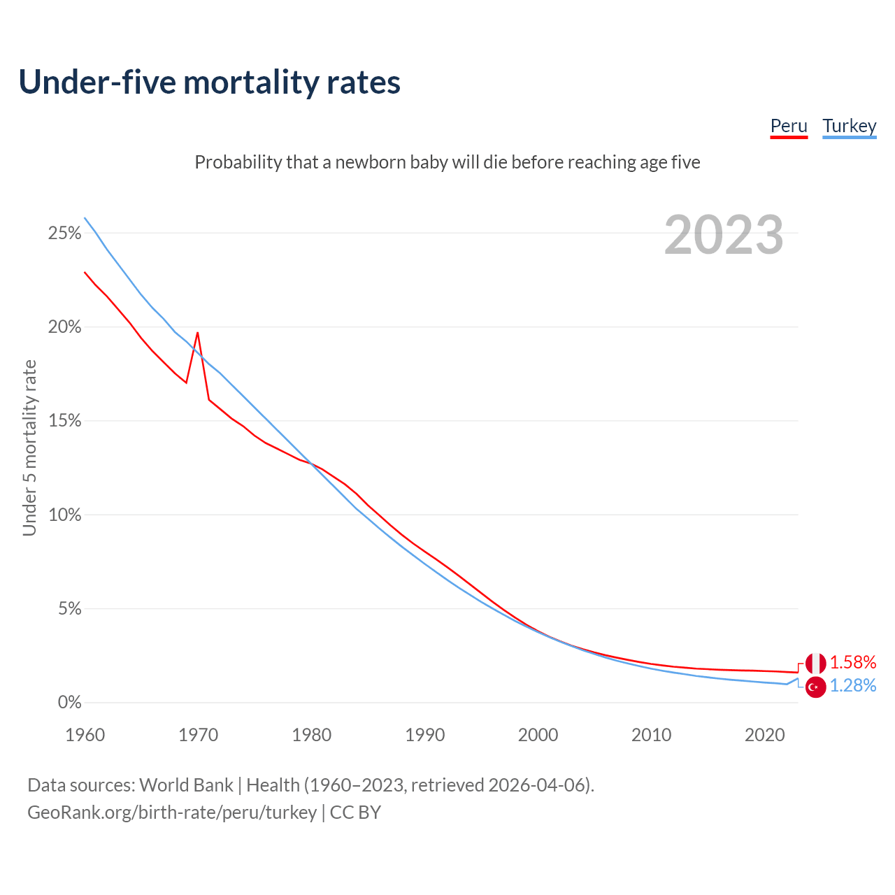The chance that a newborn baby will die before reaching age five is 1.58% in Peru and 1.28% in Turkey. Above is a chart with historical data on under-five mortality rates.