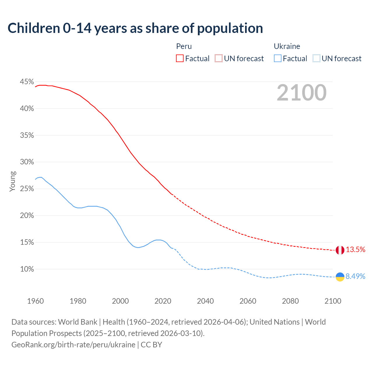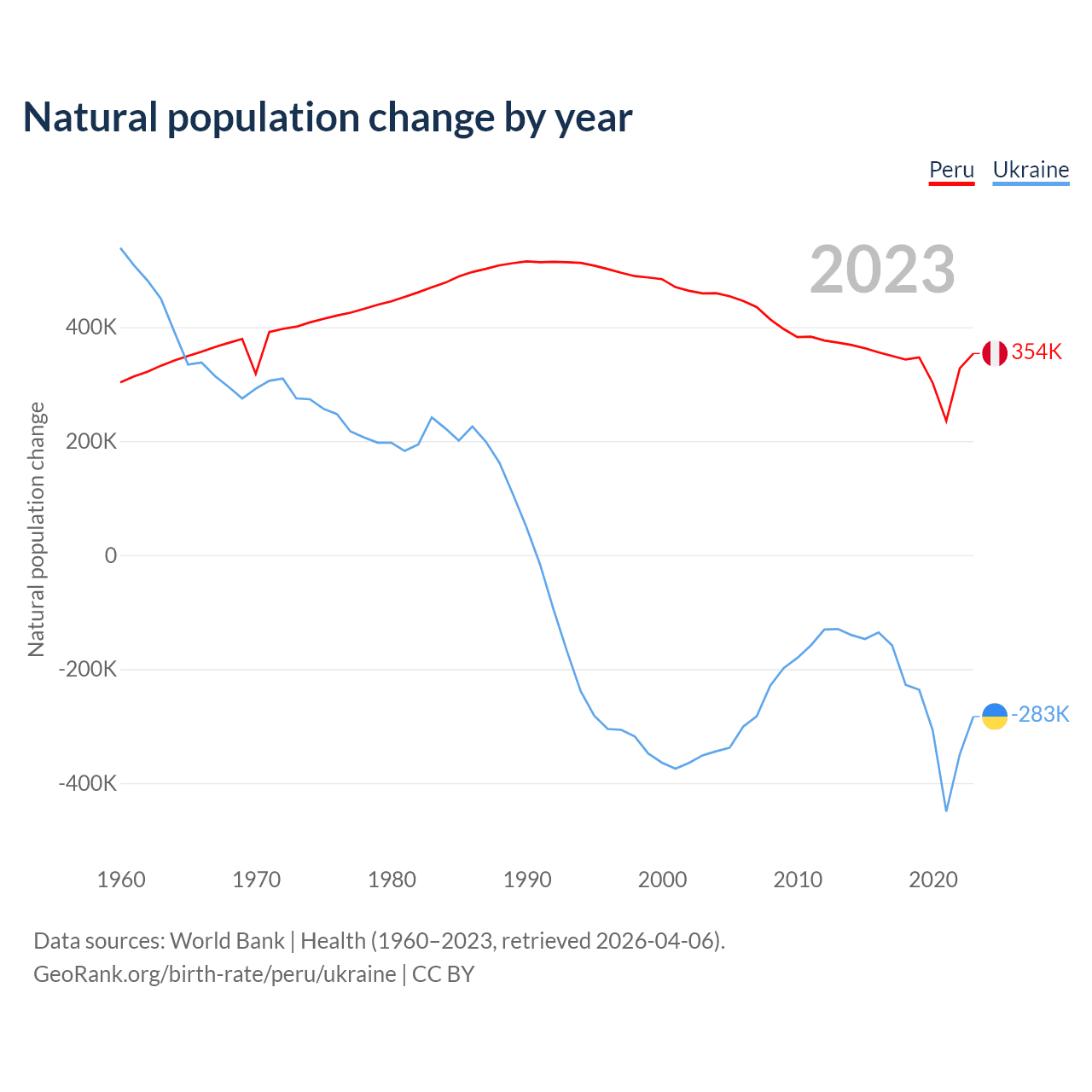 Peru has an annual birth rate of 15.9 births per 1,000 people, compared to 5.63 for Ukraine. The average number of children a woman is expected to have during her lifetime — the fertility rate, is 1.98 in Peru and 0.98 in Ukraine — 50.7% difference.