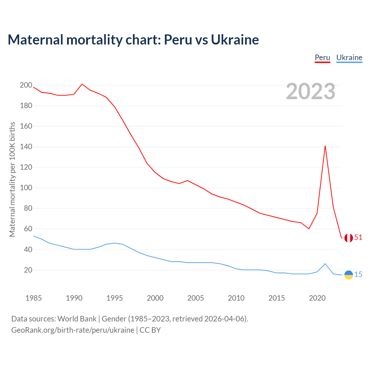 The maternal mortality rate, which is the probability of dying during childbirth or within 42 days of pregnancy termination, is 51 deaths per 100,000 live births in Peru, compared to 15 deaths in Ukraine.