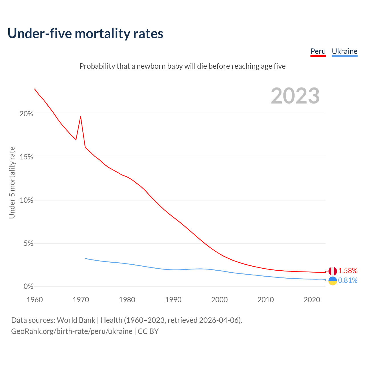 The chance that a newborn baby will die before reaching age five is 1.58% in Peru and 0.81% in Ukraine. Above is a chart with historical data on under-five mortality rates.
