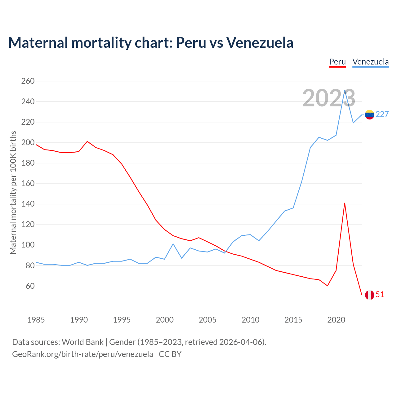 The maternal mortality rate, which is the probability of dying during childbirth or within 42 days of pregnancy termination, is 51 deaths per 100,000 live births in Peru, compared to 227 deaths in Venezuela.