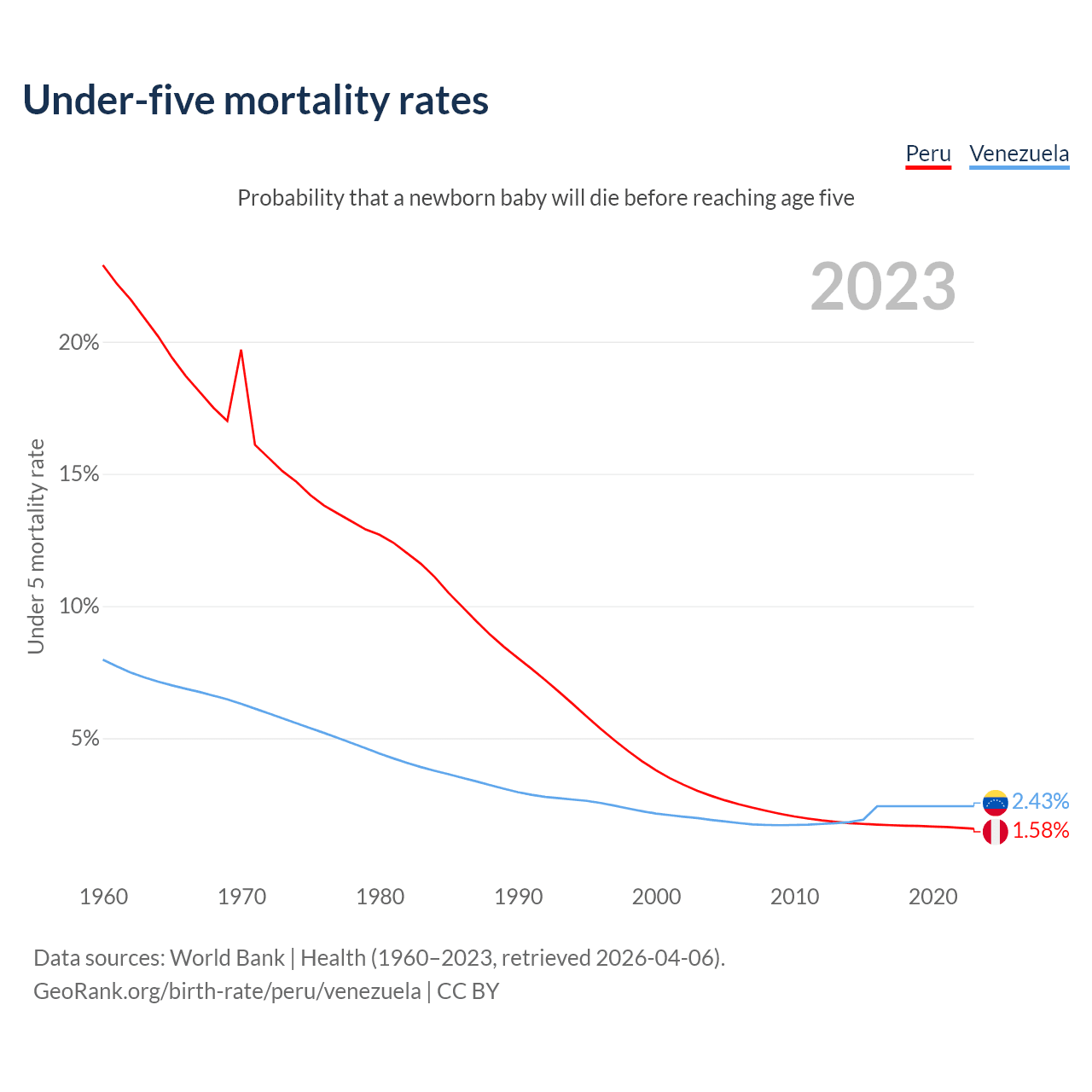 The chance that a newborn baby will die before reaching age five is 1.58% in Peru and 2.43% in Venezuela. Above is a chart with historical data on under-five mortality rates.