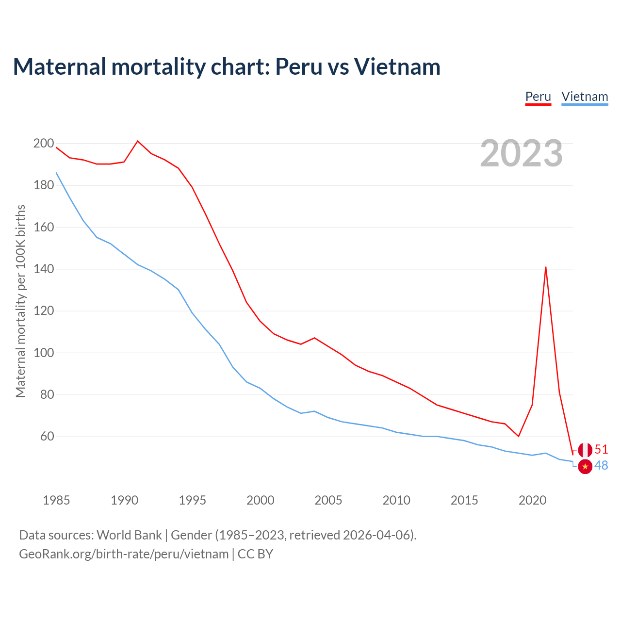 The maternal mortality rate, which is the probability of dying during childbirth or within 42 days of pregnancy termination, is 51 deaths per 100,000 live births in Peru, compared to 48 deaths in Vietnam.