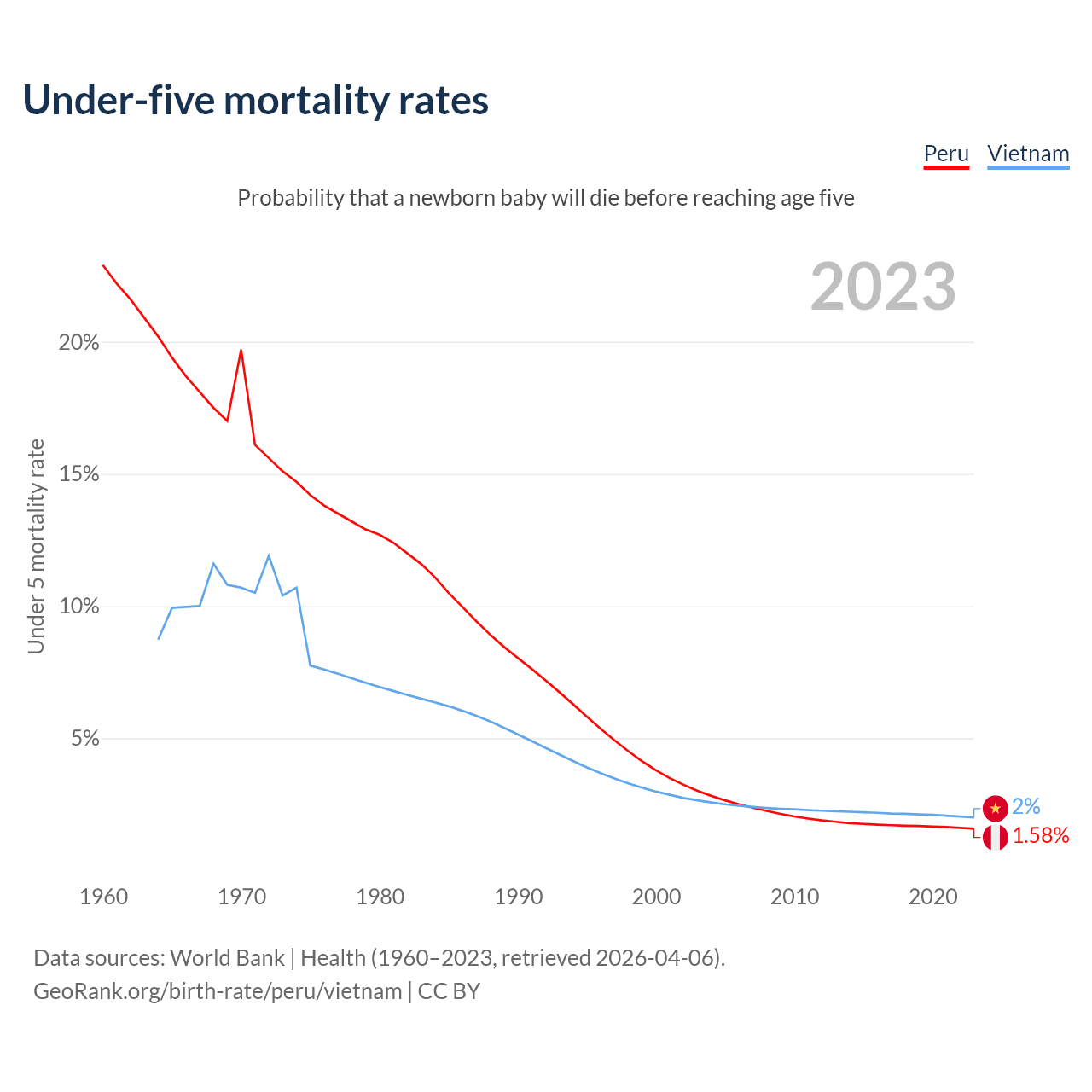 The chance that a newborn baby will die before reaching age five is 1.58% in Peru and 2% in Vietnam. Above is a chart with historical data on under-five mortality rates.