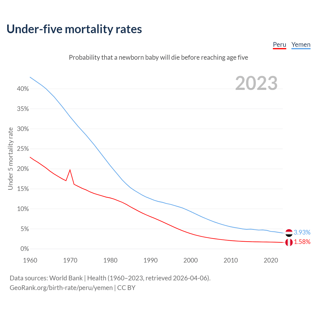 The chance that a newborn baby will die before reaching age five is 1.58% in Peru and 3.93% in Yemen. Above is a chart with historical data on under-five mortality rates.