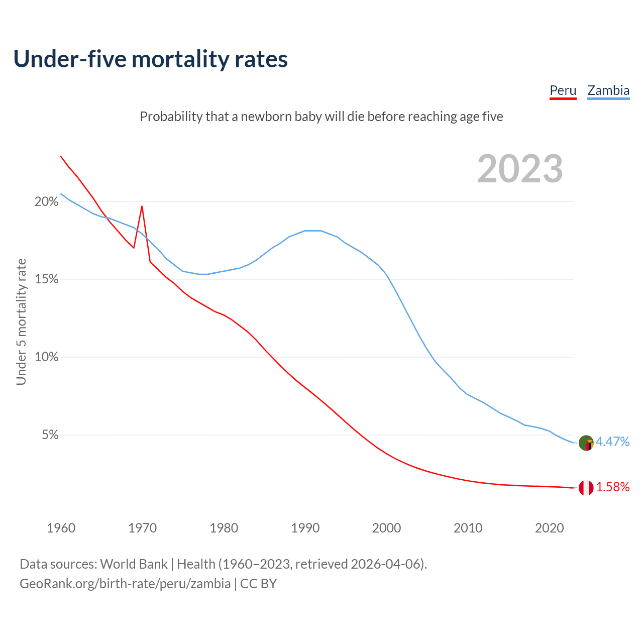The chance that a newborn baby will die before reaching age five is 1.58% in Peru and 4.47% in Zambia. Above is a chart with historical data on under-five mortality rates.