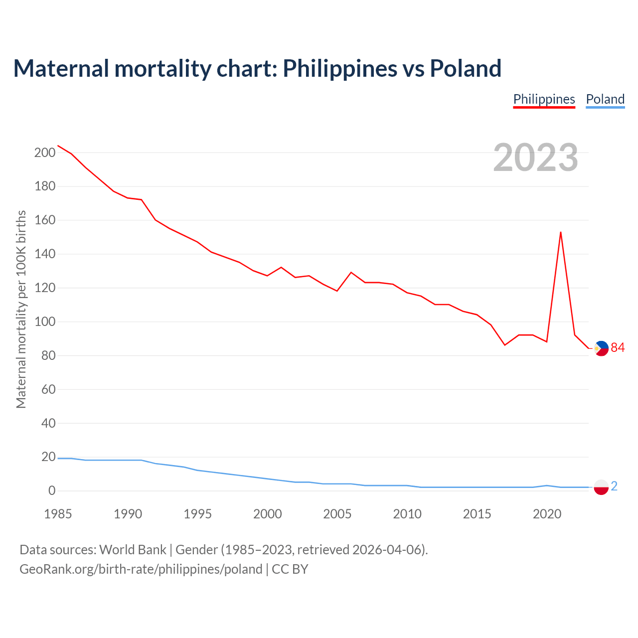The maternal mortality rate, which is the probability of dying during childbirth or within 42 days of pregnancy termination, is 84 deaths per 100,000 live births in the Philippines, compared to 2 deaths in Poland.