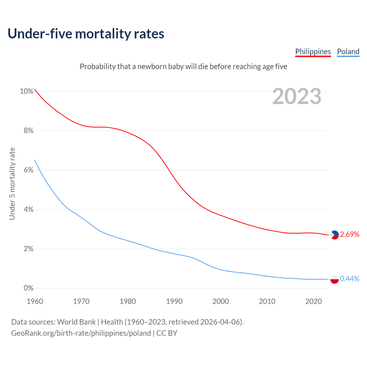 The chance that a newborn baby will die before reaching age five is 2.69% in the Philippines and 0.44% in Poland. Above is a chart with historical data on under-five mortality rates.