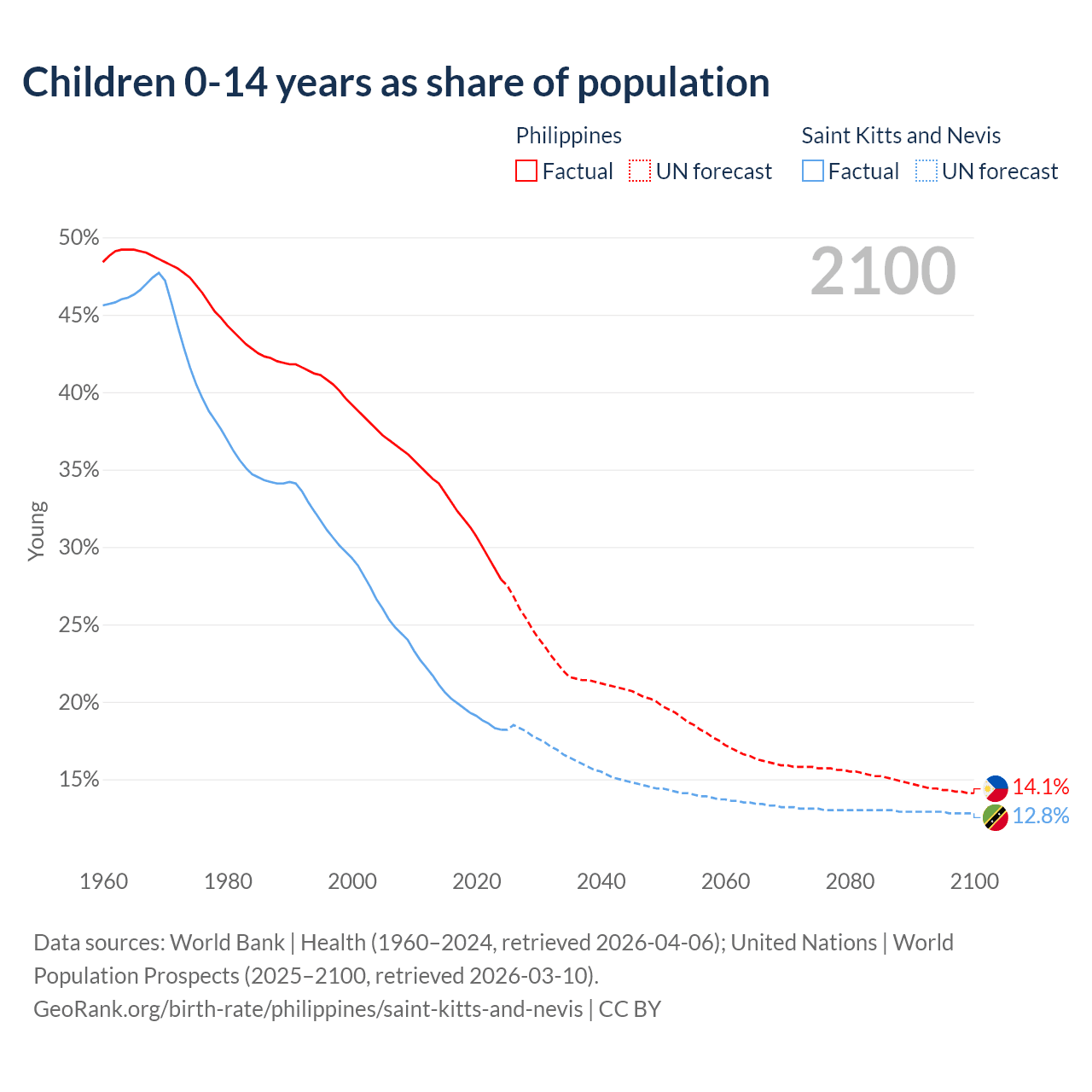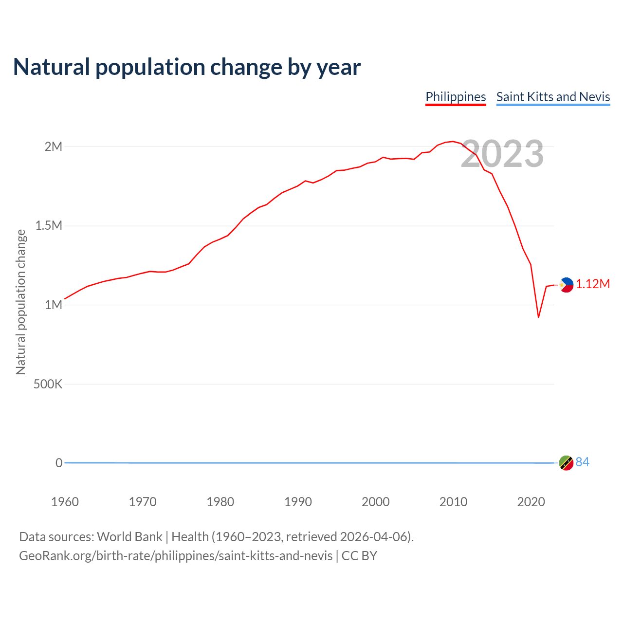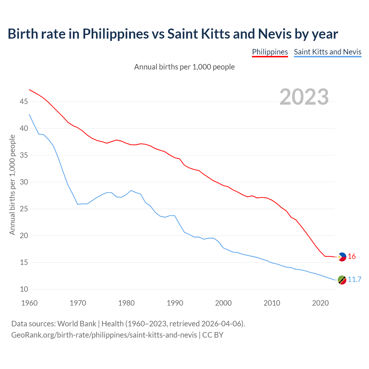 The Philippines has an annual birth rate of 16 births per 1,000 people, compared to 11.7 for Saint Kitts and Nevis. The average number of children a woman is expected to have during her lifetime — the fertility rate, is 1.92 in the Philippines and 1.51 in Saint Kitts and Nevis — 21.5% difference.