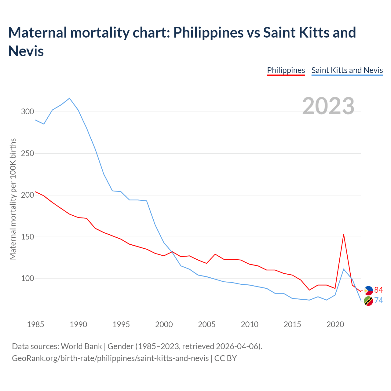 The maternal mortality rate, which is the probability of dying during childbirth or within 42 days of pregnancy termination, is 84 deaths per 100,000 live births in the Philippines, compared to 74 deaths in Saint Kitts and Nevis.