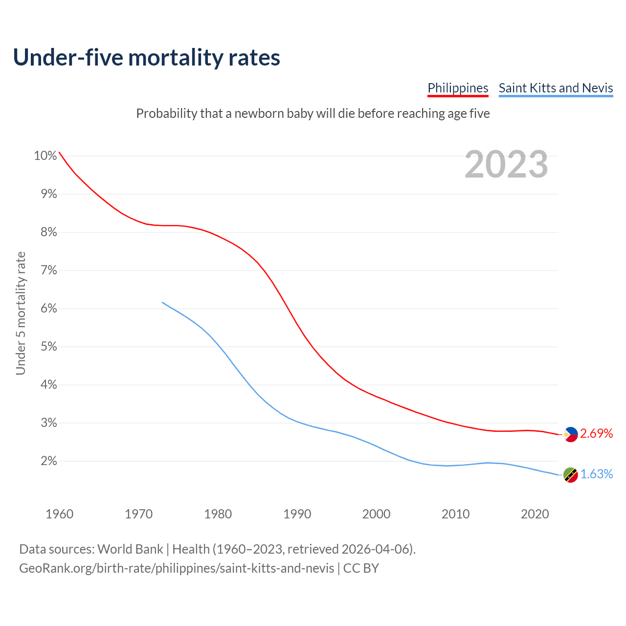 The chance that a newborn baby will die before reaching age five is 2.69% in the Philippines and 1.63% in Saint Kitts and Nevis. Above is a chart with historical data on under-five mortality rates.