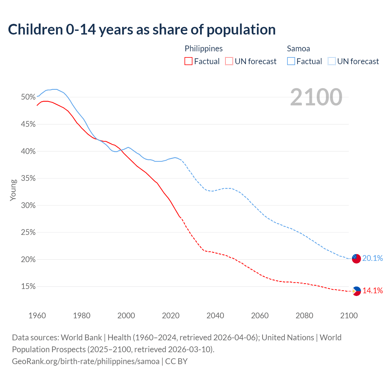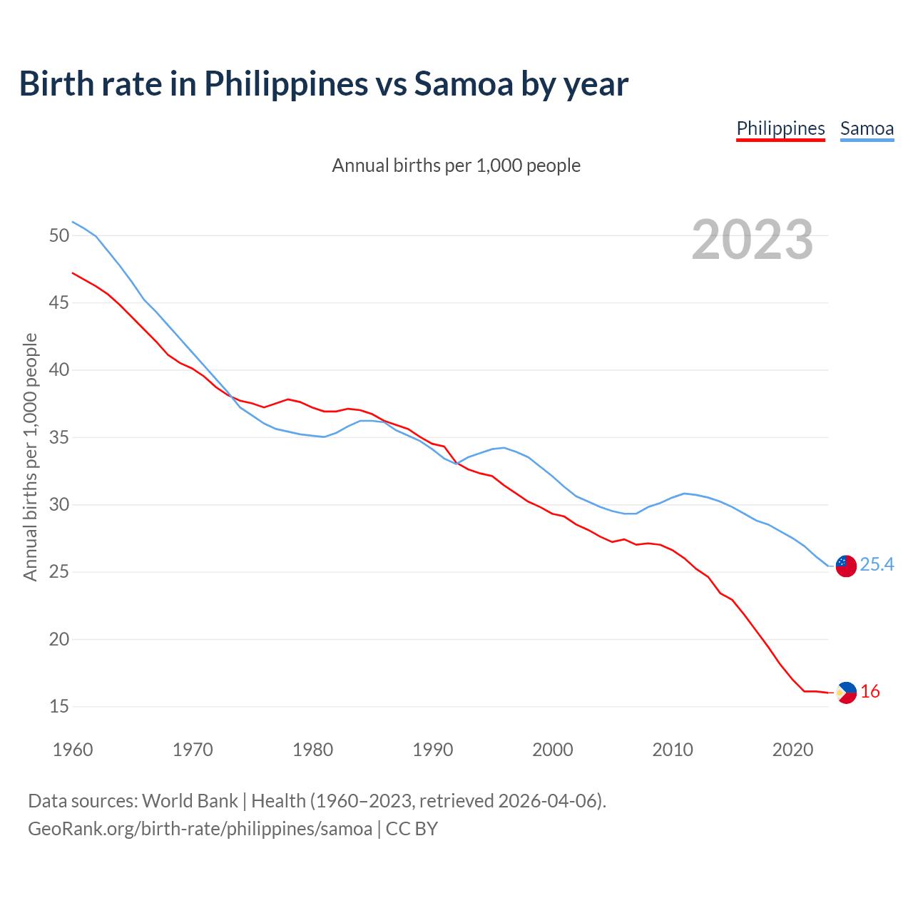 The Philippines has an annual birth rate of 16 births per 1,000 people, compared to 25.4 for Samoa. The average number of children a woman is expected to have during her lifetime — the fertility rate, is 1.92 in the Philippines and 3.83 in Samoa — 99.8% difference.