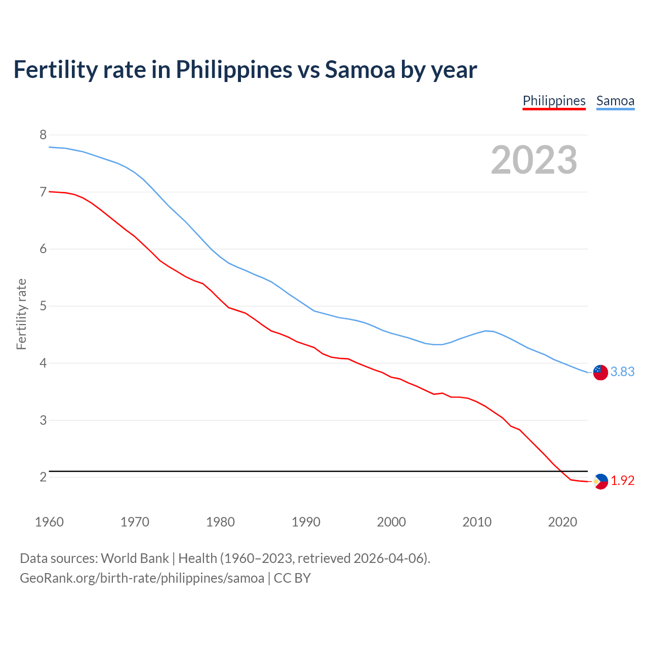 According to the latest available data on birth rates, the fertility rate in the Philippines was 1.92 children per woman in 2023, compared to 3.83 in Samoa in 2023. The replacement level is considered to be 2.1 children per woman.