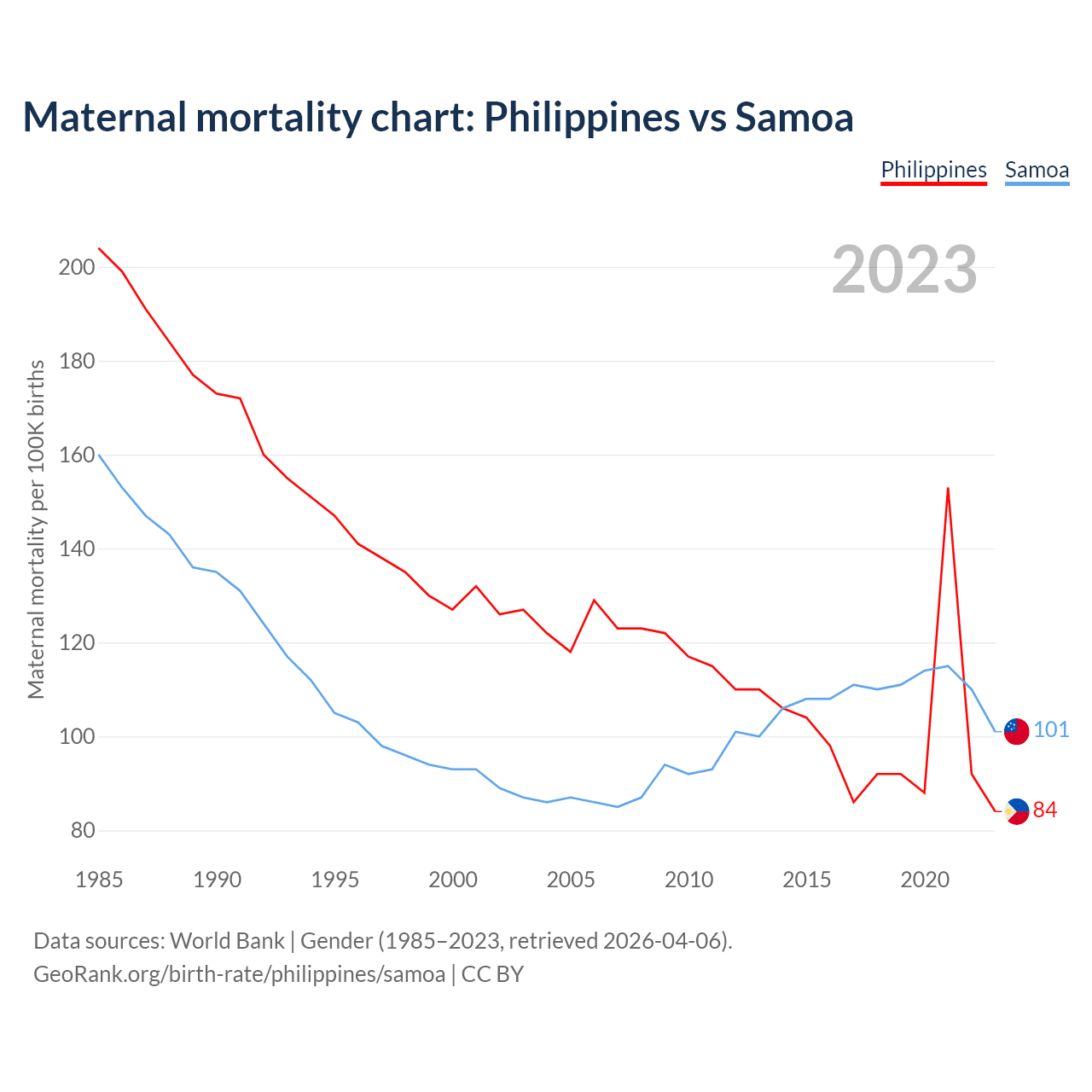 The maternal mortality rate, which is the probability of dying during childbirth or within 42 days of pregnancy termination, is 84 deaths per 100,000 live births in the Philippines, compared to 101 deaths in Samoa.