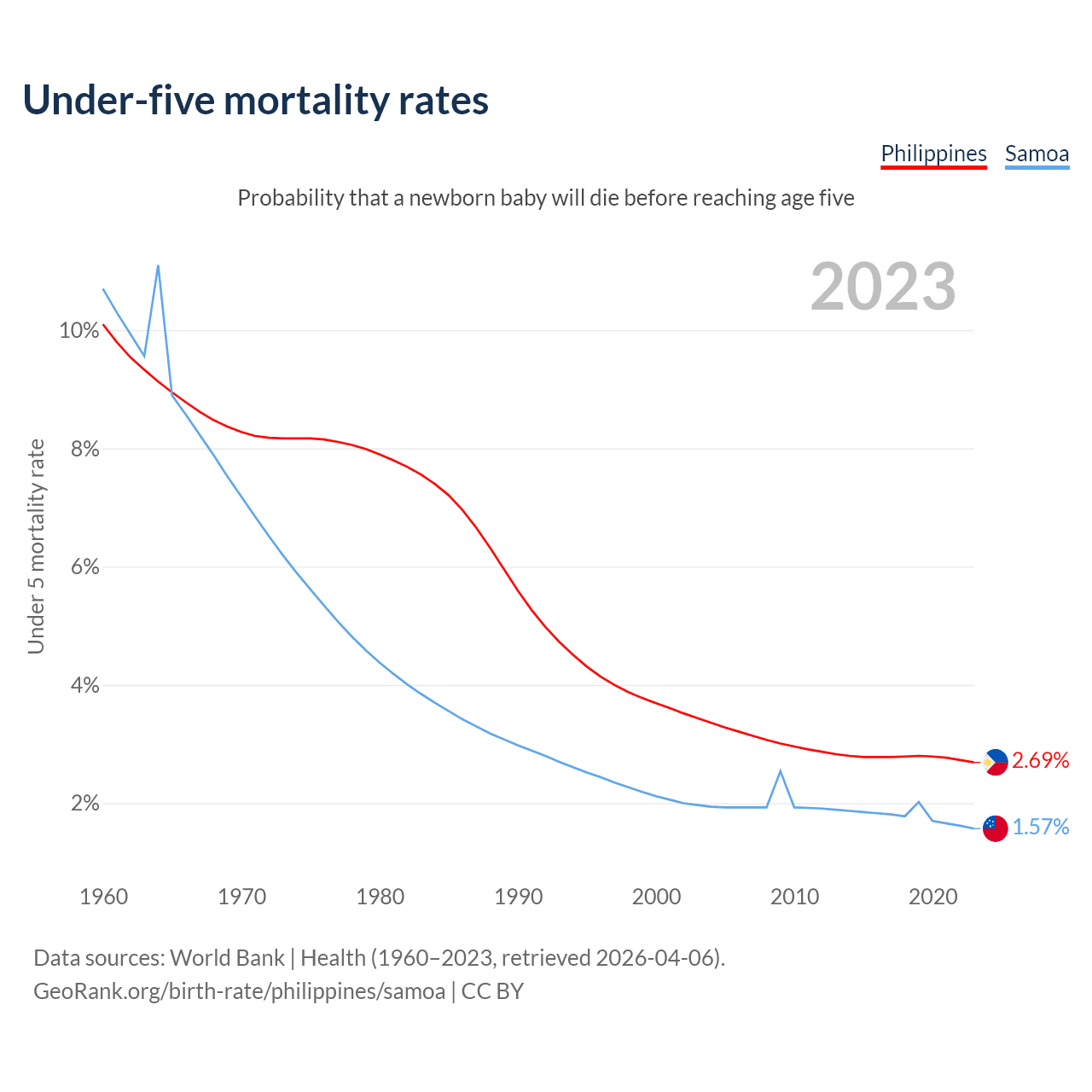 The chance that a newborn baby will die before reaching age five is 2.69% in the Philippines and 1.57% in Samoa. Above is a chart with historical data on under-five mortality rates.