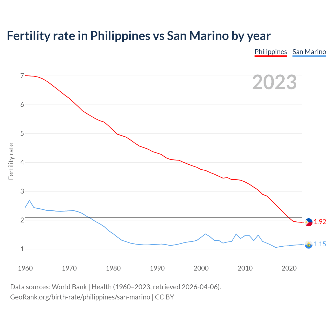 According to the latest available data on birth rates, the fertility rate in the Philippines was 1.92 children per woman in 2023, compared to 1.15 in San Marino in 2023. The replacement level is considered to be 2.1 children per woman.
