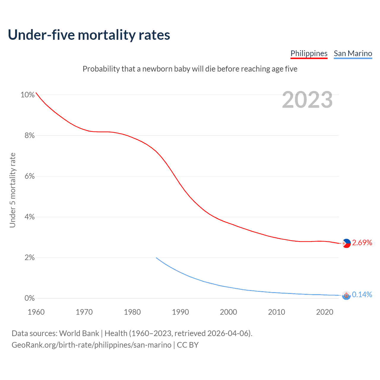 The chance that a newborn baby will die before reaching age five is 2.69% in the Philippines and 0.14% in San Marino. Above is a chart with historical data on under-five mortality rates.