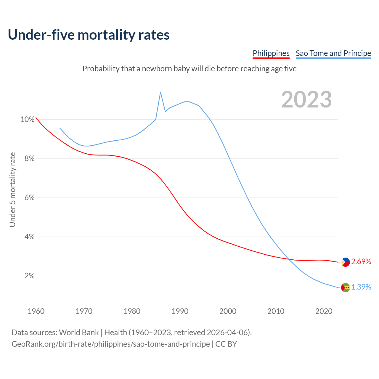 The chance that a newborn baby will die before reaching age five is 2.69% in the Philippines and 1.39% in Sao Tome and Principe. Above is a chart with historical data on under-five mortality rates.