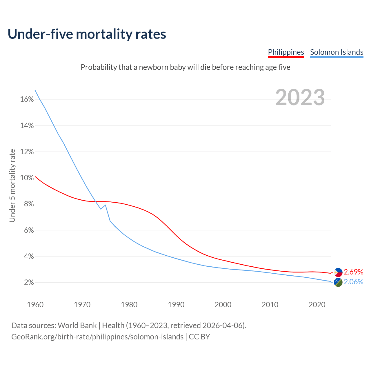 The chance that a newborn baby will die before reaching age five is 2.69% in the Philippines and 2.06% in the Solomon Islands. Above is a chart with historical data on under-five mortality rates.