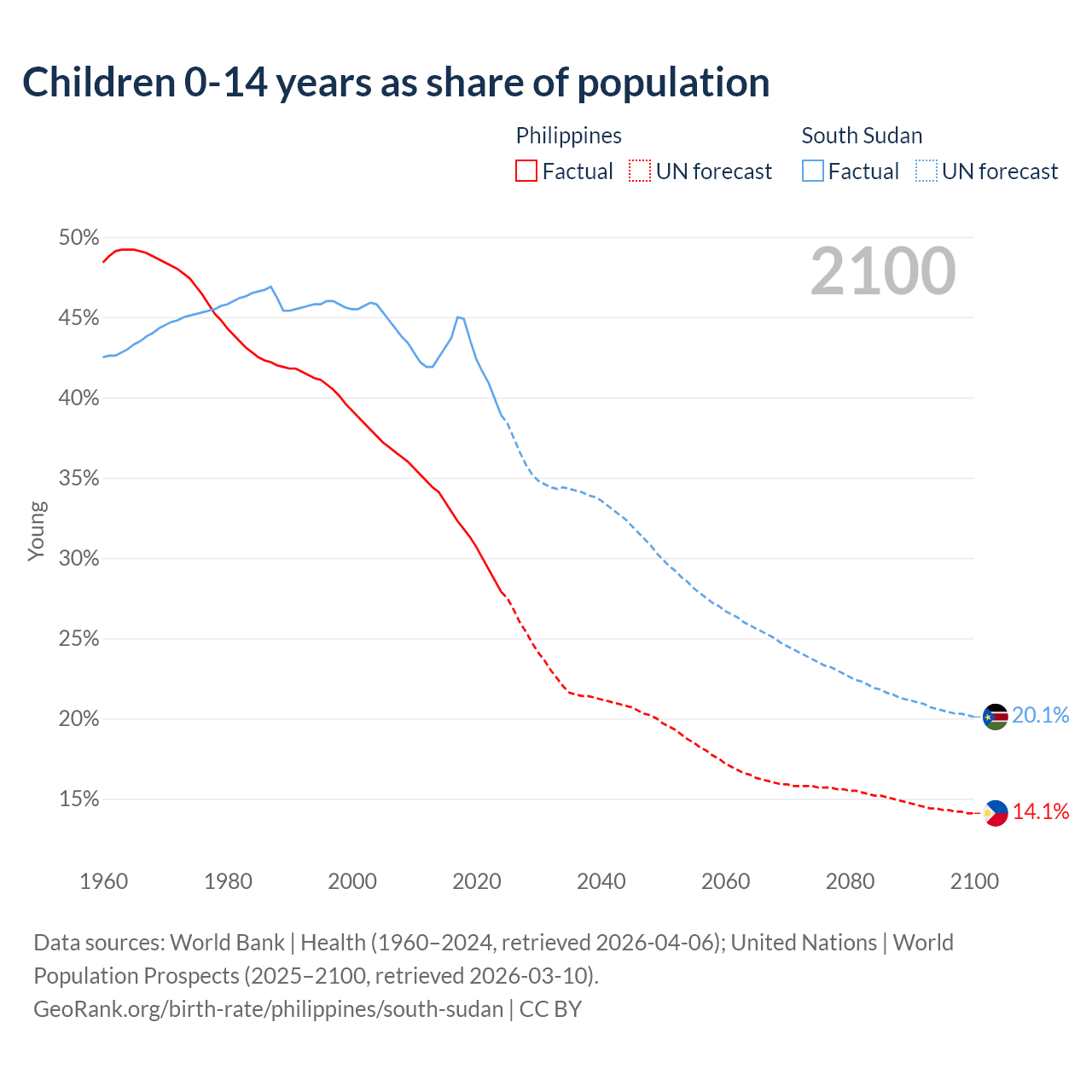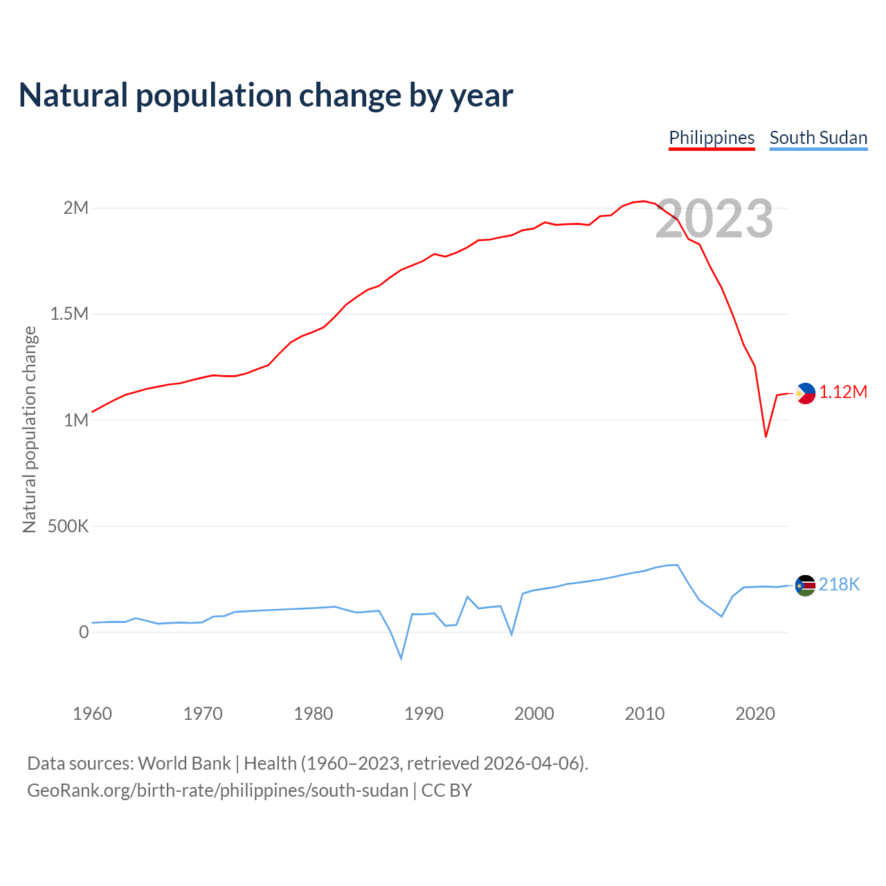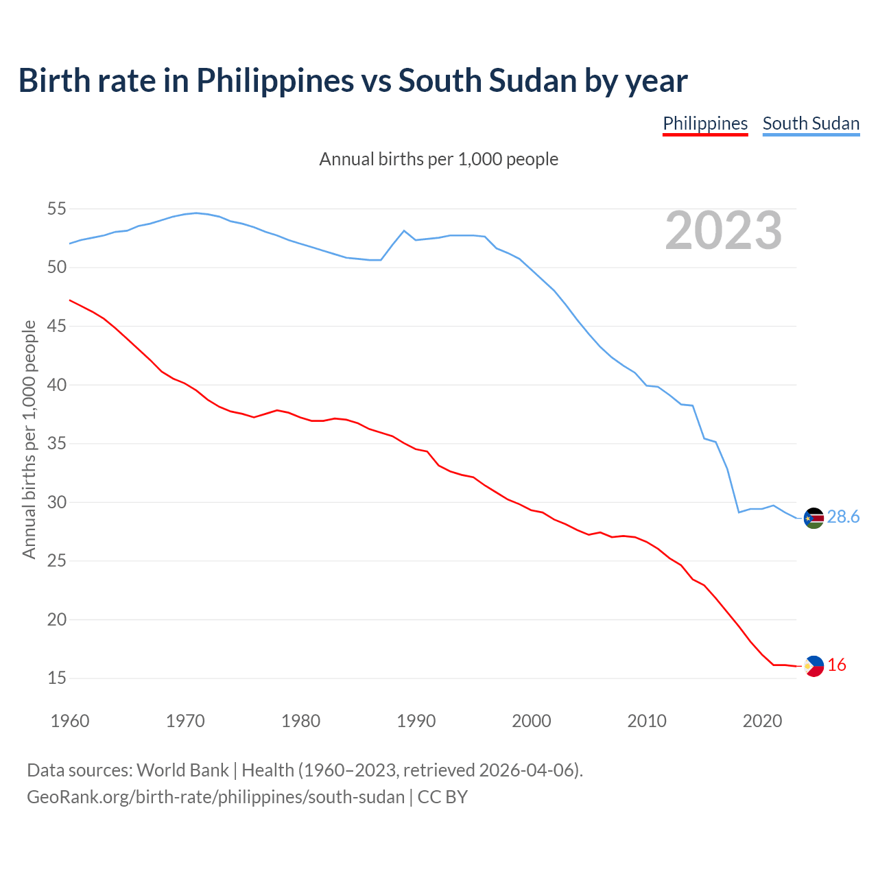 The Philippines has an annual birth rate of 16 births per 1,000 people, compared to 28.6 for South Sudan. The average number of children a woman is expected to have during her lifetime — the fertility rate, is 1.92 in the Philippines and 3.86 in South Sudan — 101.7% difference.