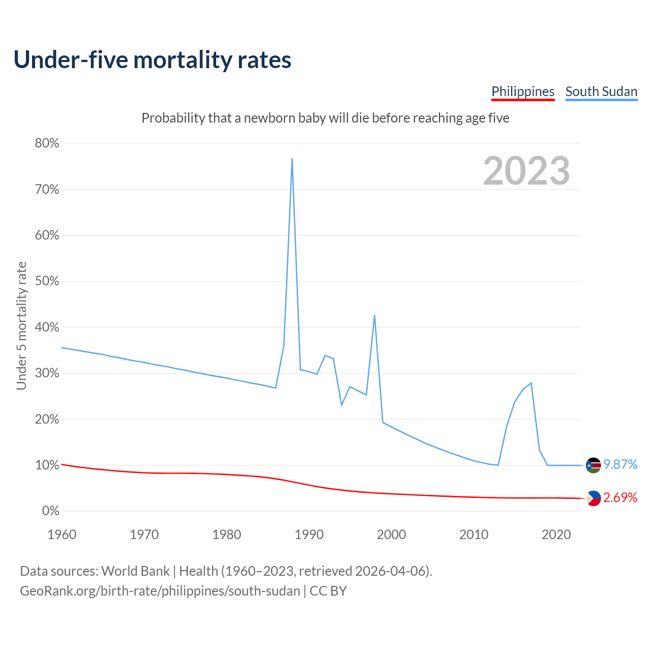 The chance that a newborn baby will die before reaching age five is 2.69% in the Philippines and 9.87% in South Sudan. Above is a chart with historical data on under-five mortality rates.