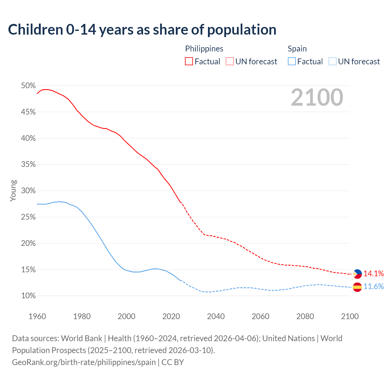 The Philippines has an annual birth rate of 16 births per 1,000 people, compared to 6.7 for Spain. The average number of children a woman is expected to have during her lifetime — the fertility rate, is 1.92 in the Philippines and 1.12 in Spain — 41.5% difference.