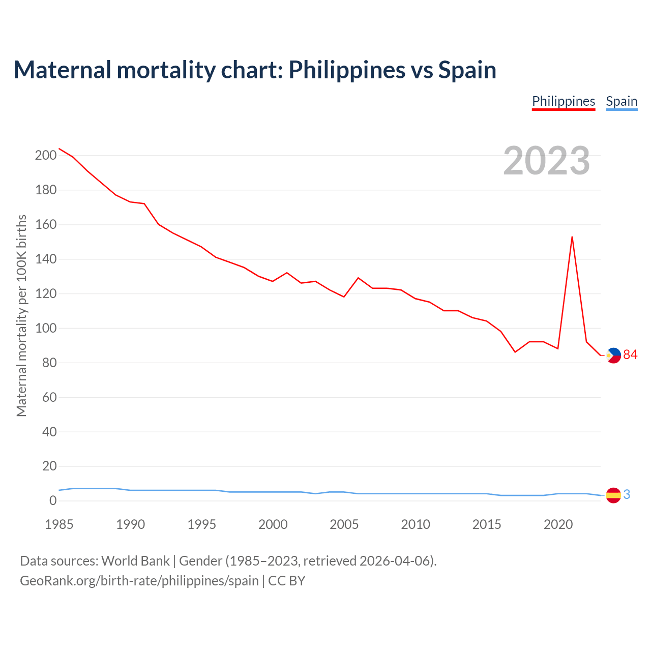 The maternal mortality rate, which is the probability of dying during childbirth or within 42 days of pregnancy termination, is 84 deaths per 100,000 live births in the Philippines, compared to 3 deaths in Spain.