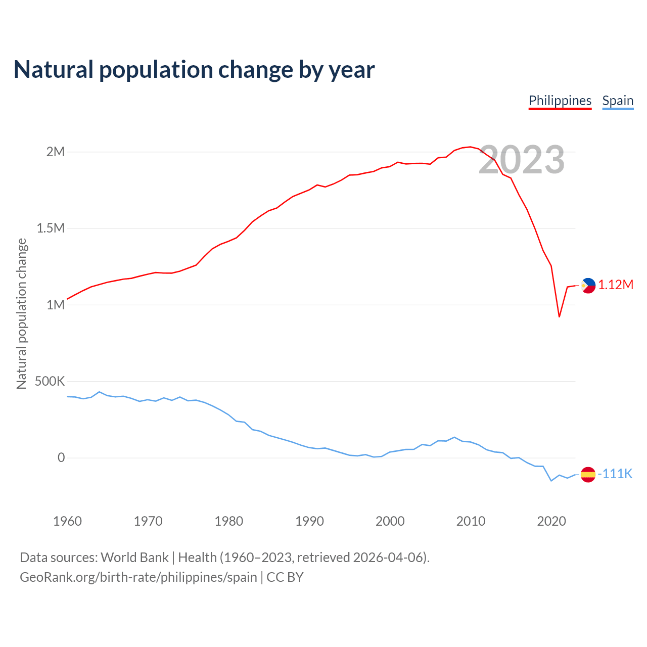 According to the latest available data on birth rates, the fertility rate in the Philippines was 1.92 children per woman in 2023, compared to 1.12 in Spain in 2023. The replacement level is considered to be 2.1 children per woman.