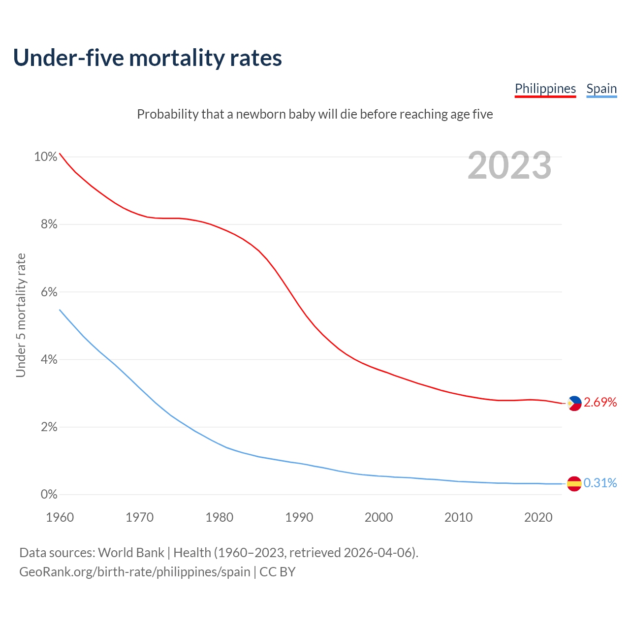 The chance that a newborn baby will die before reaching age five is 2.69% in the Philippines and 0.31% in Spain. Above is a chart with historical data on under-five mortality rates.